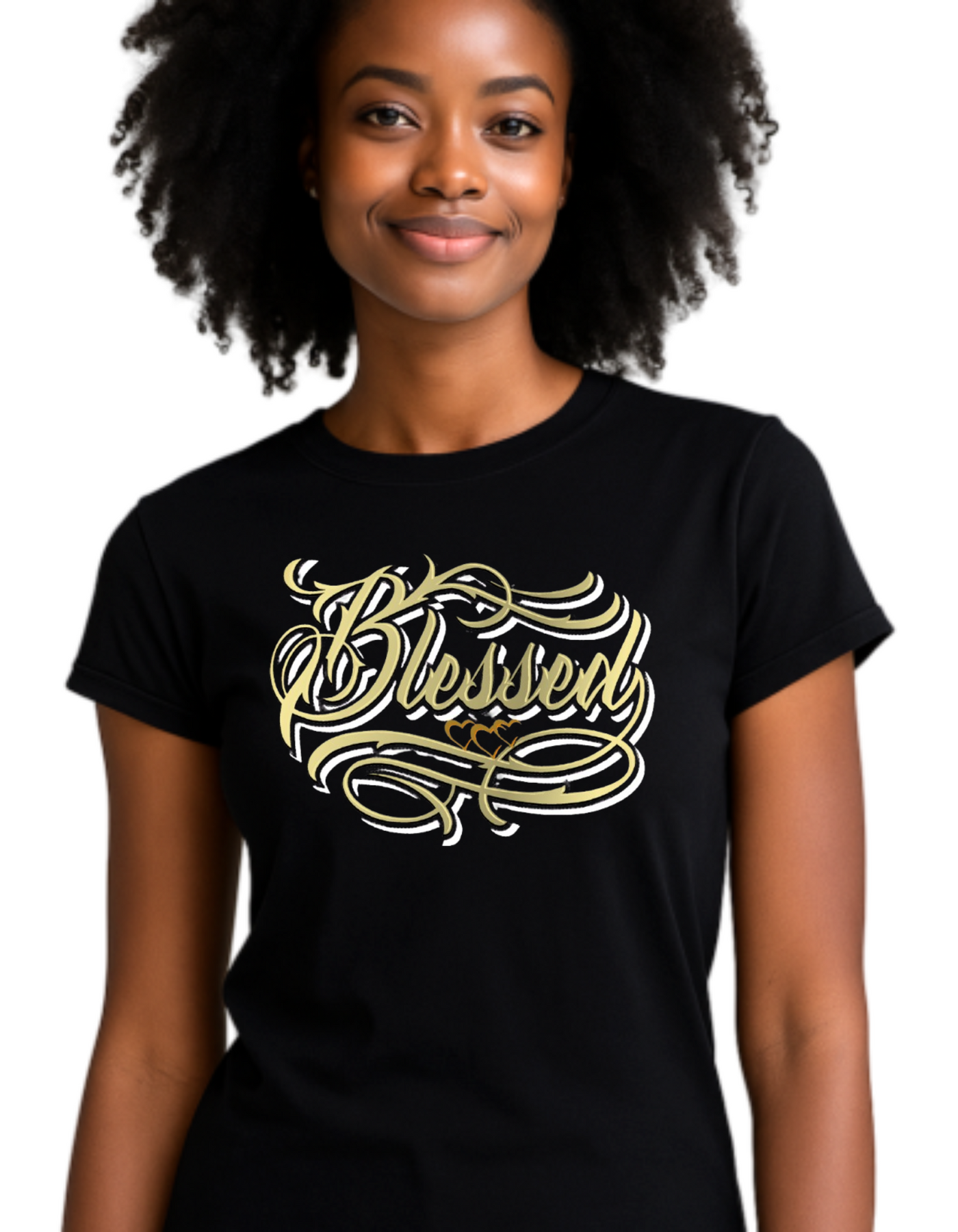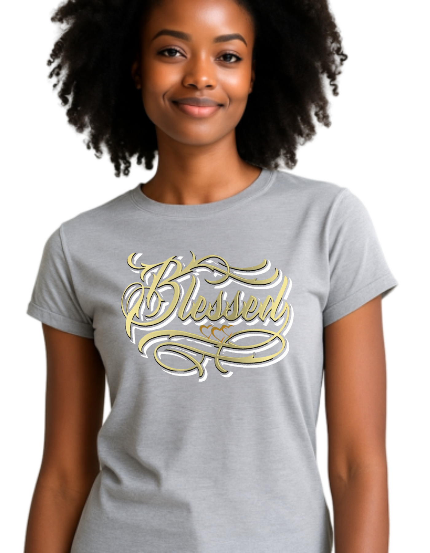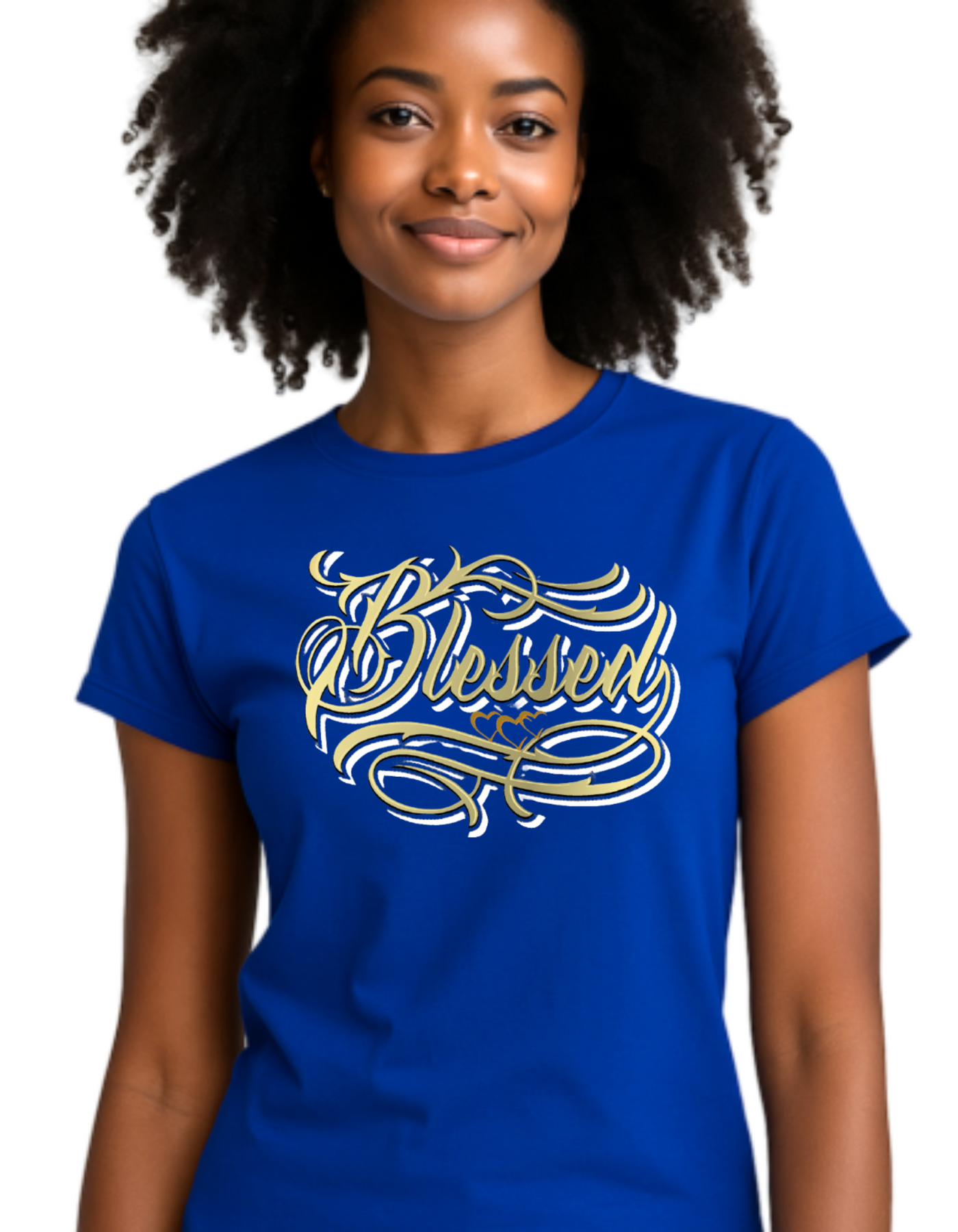 Make a bold statement of faith with this beautifully designed 'Blessed' script t-shirt. The elegant gold and white calligraphy artwork creates an eye-catching contrast against the vibrant royal blue background. This classic crew neck t-shirt combines style with comfort, featuring a versatile design that pairs well with jeans, skirts, or casual wear. The shirt comes in multiple color options including grey, black, and red, allowing you to choose the perfect shade that matches your style. Perfect for casual outings, church events, or as an inspiring everyday wardrobe staple, this t-shirt lets you share your gratitude while looking fashionable. The short-sleeve design and classic fit make it suitable for year-round wear. The artistic script design adds a touch of sophistication to this comfortable everyday t-shirt.