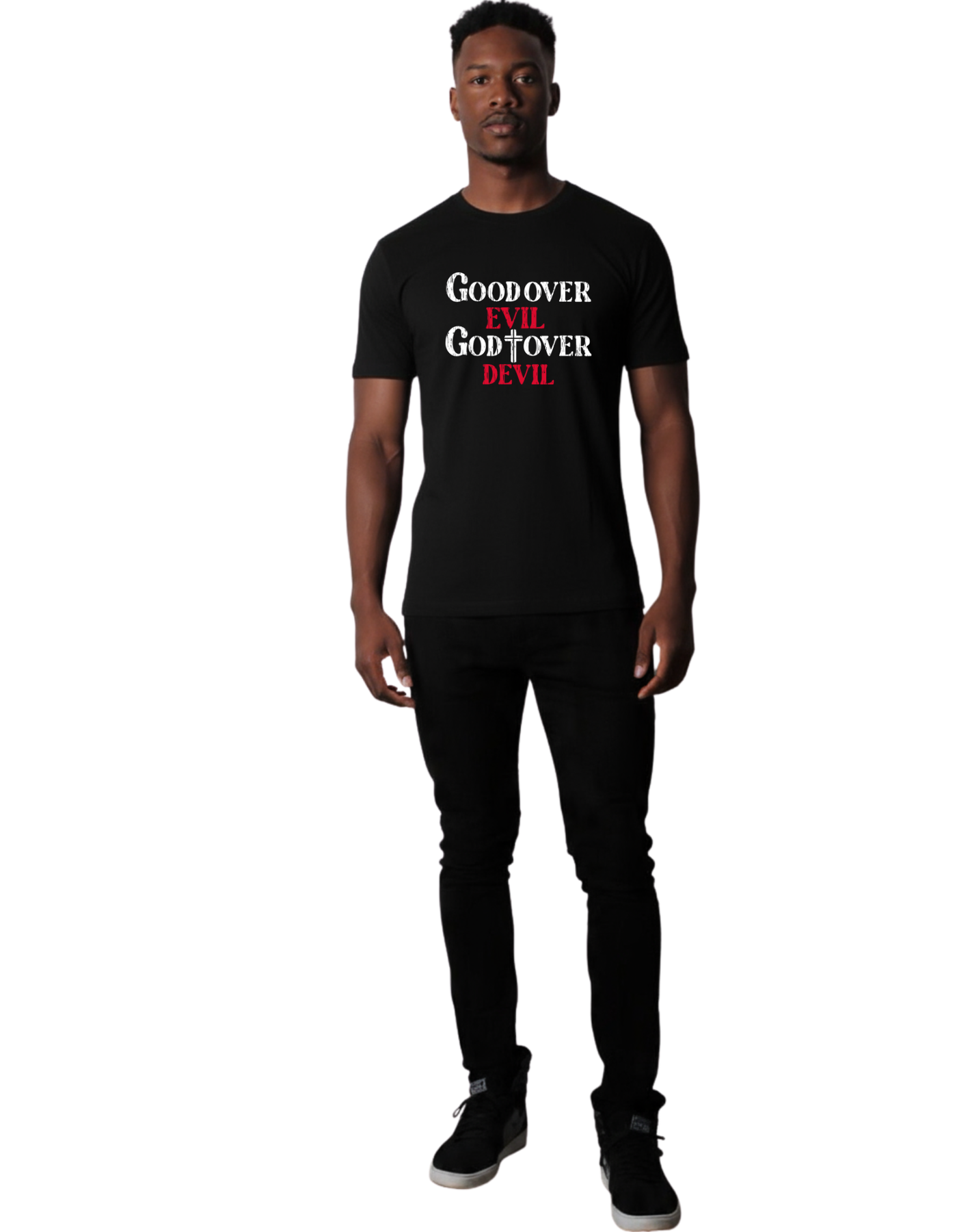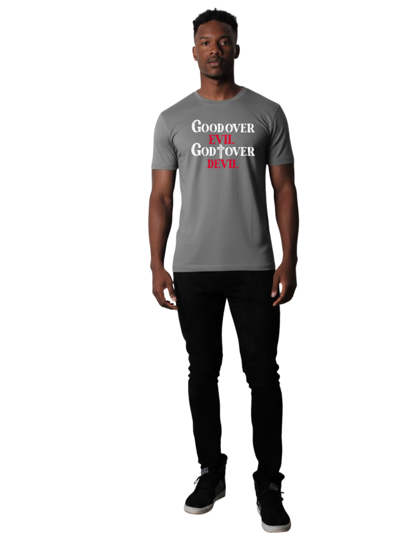 - DESIGN: Inspirational 'Good Over Evil, God Over Devil' message prominently displayed in white and red text on a classic crew neck t-shirt