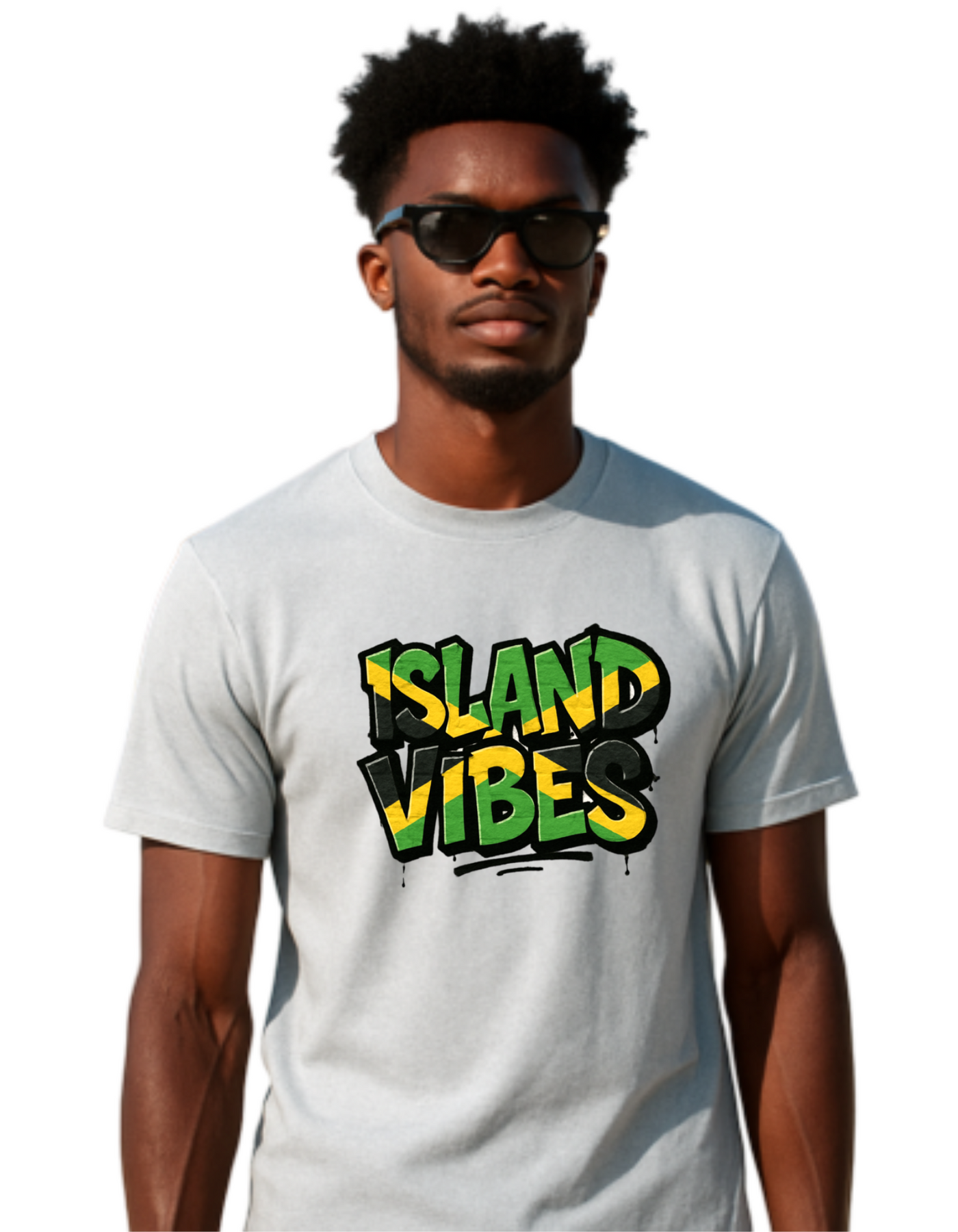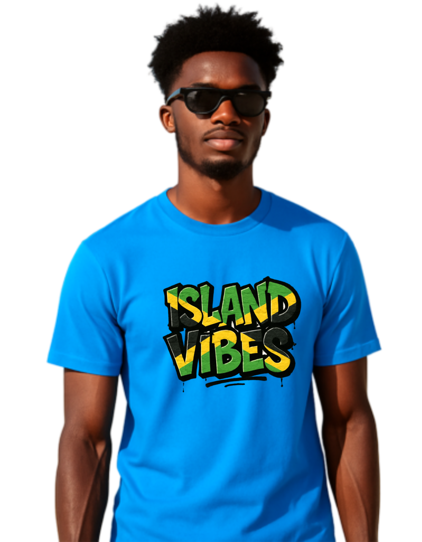Express your laid-back style with this eye-catching Island Vibes graphic t-shirt. The bold graffiti-style design features vibrant Jamaican-inspired colors of green, yellow, and black that pop against the crisp white background. Made for comfort and style, this casual tee is perfect for summer days, beach outings, or showing off your love for island culture. The classic crew neck and short sleeve design offers a relaxed fit that pairs easily with shorts, jeans, or swim trunks. Available in multiple color options including blue, red, and white, this versatile t-shirt lets you customize your look while maintaining that cool island aesthetic. The high-quality print ensures the graphic stays bold and clear through regular wear and washing. Whether you're heading to a festival, beach party, or just wanting to add some Caribbean flair to your wardrobe, this t-shirt delivers the perfect blend of style and comfort.