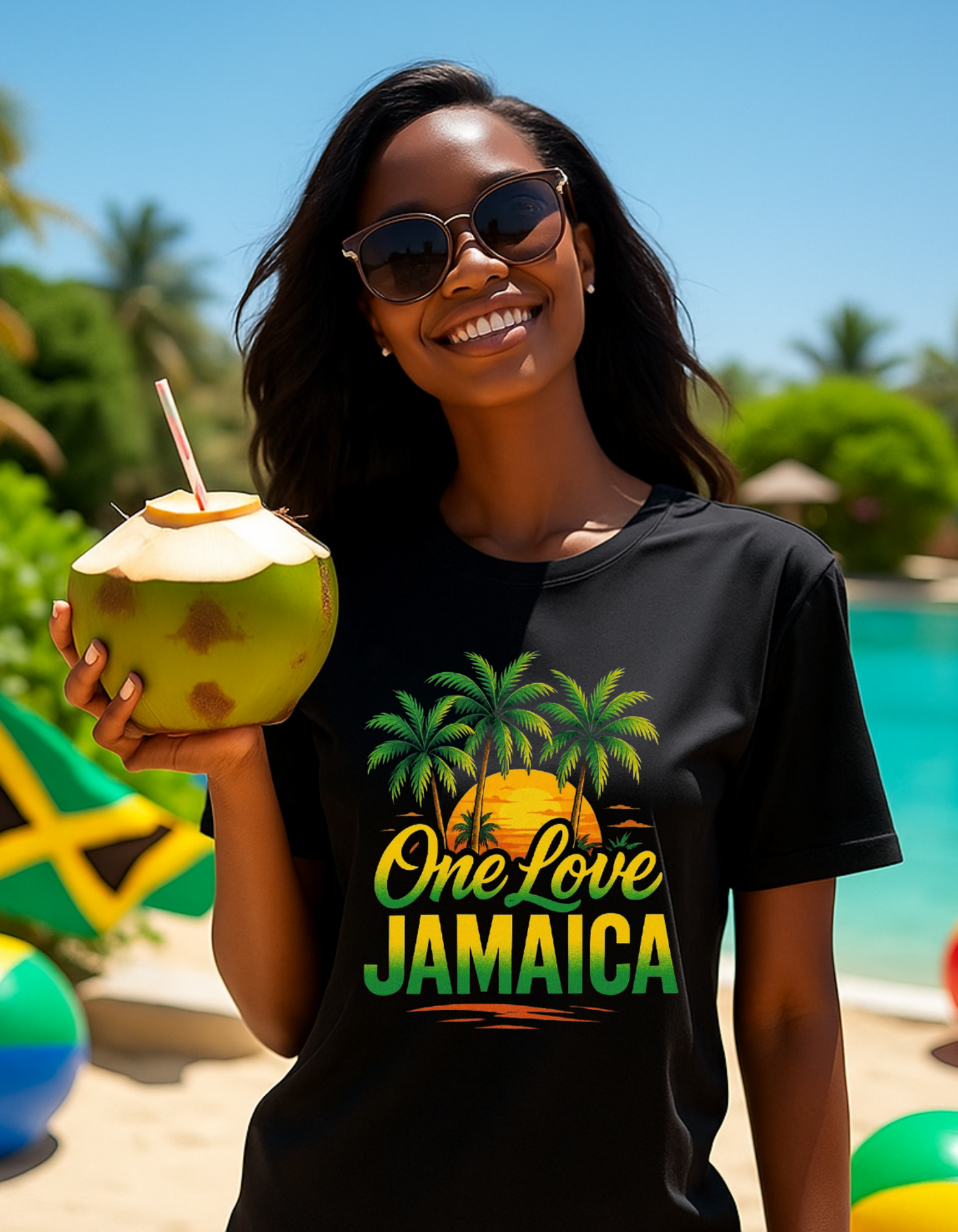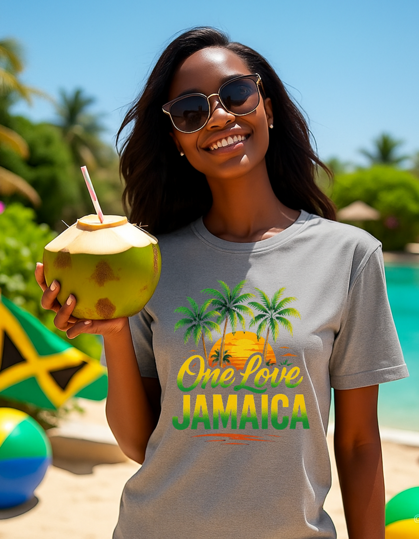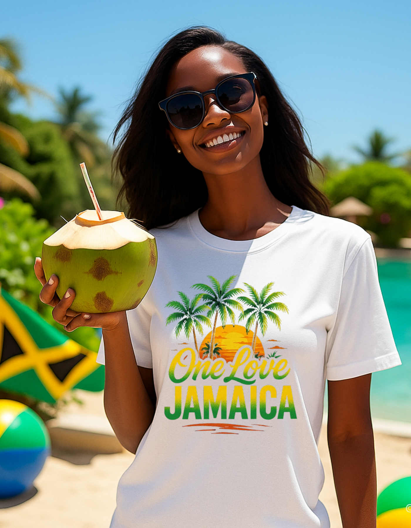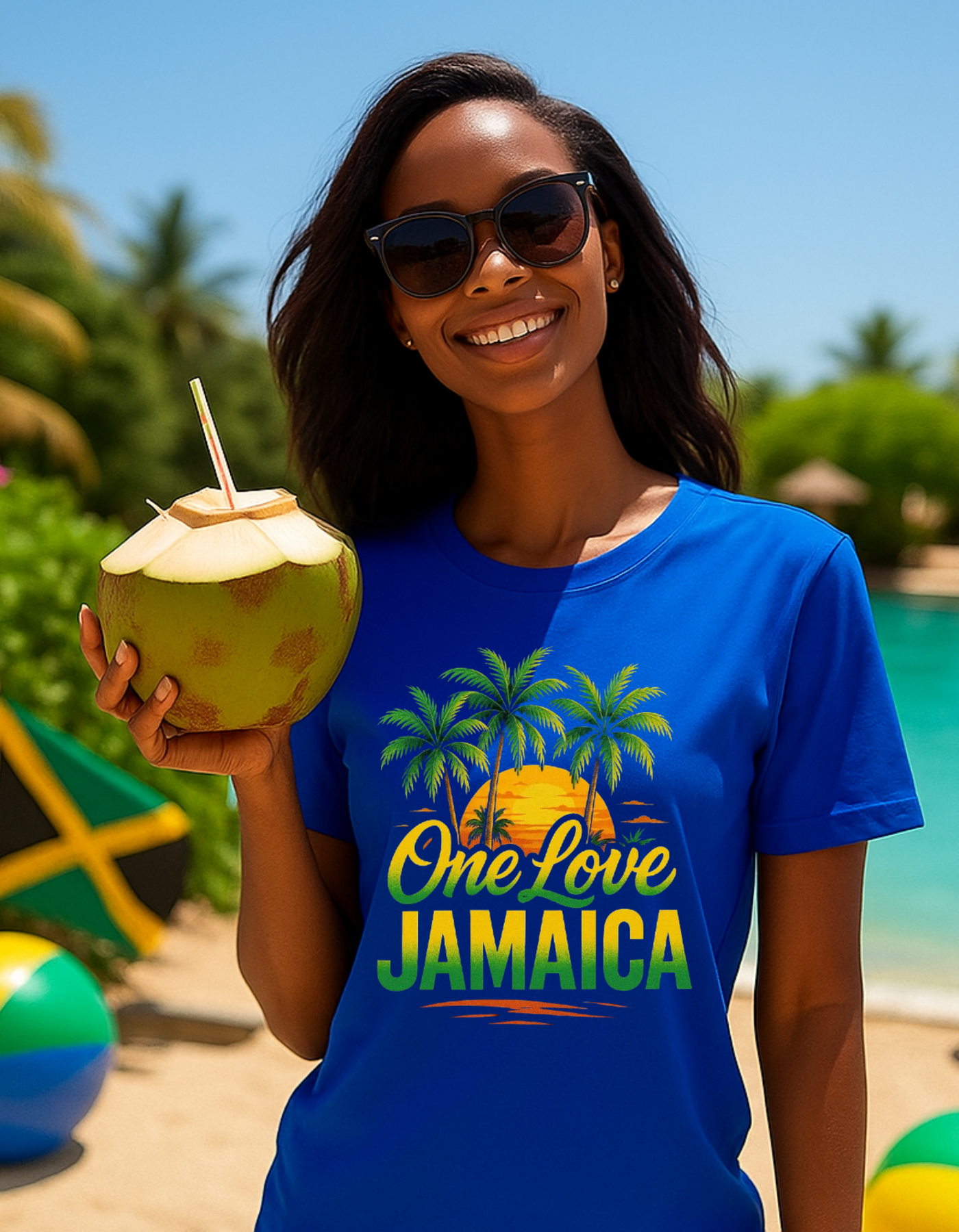 Bring the vibrant spirit of Jamaica to your wardrobe with this stunning royal blue t-shirt. The eye-catching design features a beautiful tropical sunset scene complete with swaying palm trees and the text 'One Love Jamaica' in bold yellow and green lettering - perfectly capturing the essence of island life. This casual women's short-sleeve t-shirt offers both style and comfort for everyday wear. The design showcases a perfect blend of Caribbean colors, with the sunset's warm orange glow contrasting beautifully against the royal blue background. Available in multiple colors including red, grey, white, and black, this t-shirt lets you choose the perfect shade to match your style. The classic crew neck and short sleeve design make it versatile enough to pair with shorts, skirts, or jeans for a casual yet distinctive look. Show your love for Jamaica's culture and laid-back lifestyle with this eye-catching piece that's sure to become a favorite in your casual wear collection.